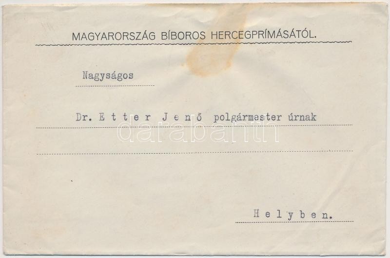 1942 Serédi Jusztinián (1884-1945) bíbornok, hercegprímás, esztergomi érsek nyomtatott meghívója Etter Jenő (1897-1973) Esztergom városi főügyész, későbbi polgármester részére, ebédmenüvel, eredeti borítékjában