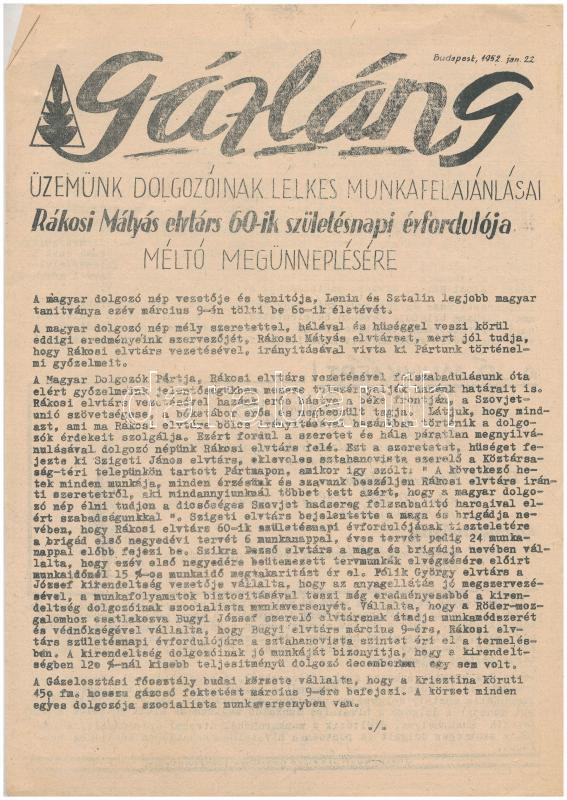 Leírás: 1952 Gázláng, Üzemünk dolgozóinak lelkes munkafelajánlásai Rákosi Mátyás elvtárs 60-ik születésnapi évfordulója méltó megünneplésére