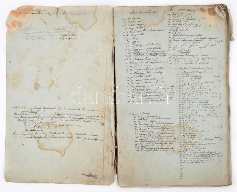 cca 1830-1850 Pápa, nagyméretű füzet különféle vegyes feljegyzésekkel: bérbeadási, eladási feljegyzések, szőlő- és más gyümölcsfajták jegyzéke, kivonatok különféle kiadványokból, stb., megviselt állapotban