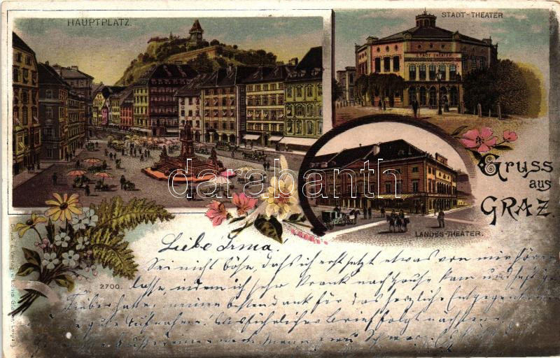 Leírás: 1899 Graz, Hauptplatz, Stadt Theater, Landes Theater / main squre, theater, floral, litho