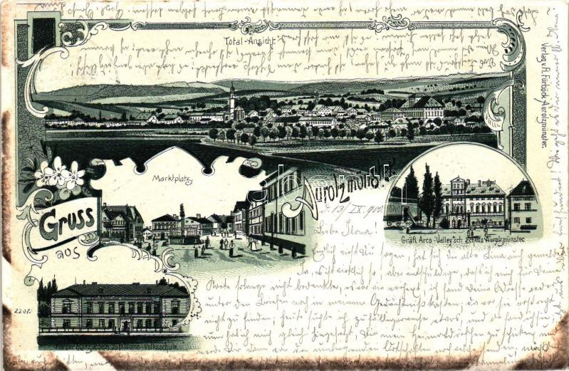 Leírás: Aurolzmünster; Marktplatz, Kaiser Franz Joseph Volksschule, Grafen Arco-Valley Schloss / market square, school, castle, Art Nouveau, litho