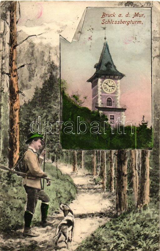 Bruck an der Mur; Schlossbergturm / tower, hunter with dog (EB) https://www.darabanth.com/hu/260-Gyorsarveres/260.0/Kepeslapok/Ausztria~100005/Bruck-an-der-Mur-Schlossbergturm-tower-hunter-with-dog-EB~II1284752