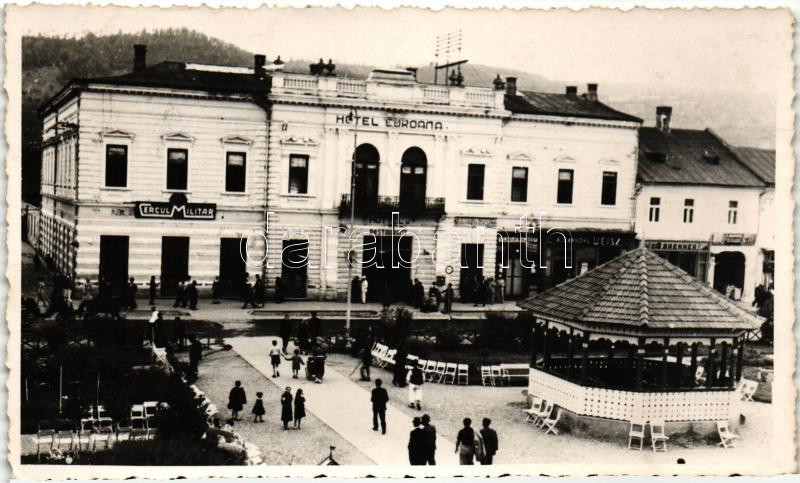 1940 Máramarossziget, Sighetu Marmatiei; 'Euroana' Szálloda, korábban Korona Szálló, Cercul Militar, Alexandru Weisz, Brenner és Vilhelm Rost(?) üzletei, pavilon / Hotel 'Euroana', formerly Hotel Korona, shops, pavilion, '1940 Máramarossziget Visszatért' So. Stpl., photo (EK)