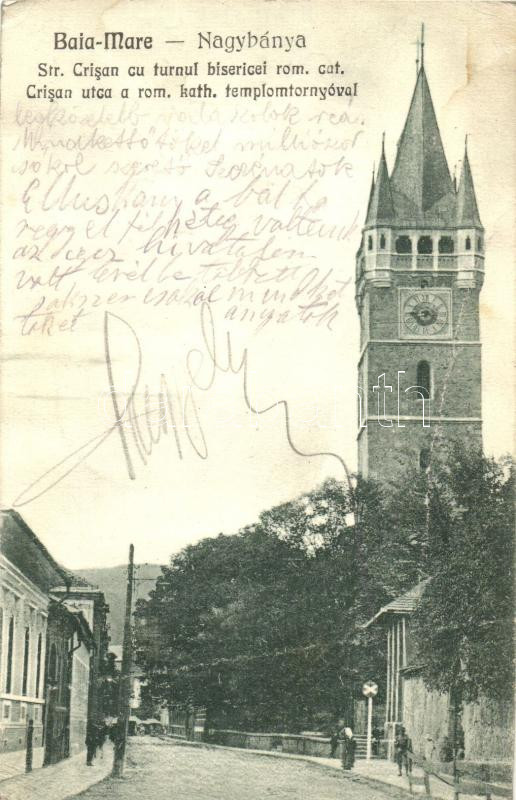 Nagybánya, Baia Mare; Crisan utca, Római Katolikus templomtorony, kiadja a Krizsanovszky könyvkereskedés / street, tower of the Roman Catholic church (fa)