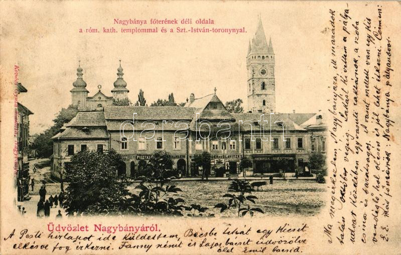 Nagybánya, Fő tér, Római katolikus templom, Szent István torony, gyógyszertár, Hanzulovics K., Weinerberger és Glavitzky, Pusztay és Blau és Klein üzlete, Kovács Gyula kiadása / main square, church, tower, shops (Rb)
