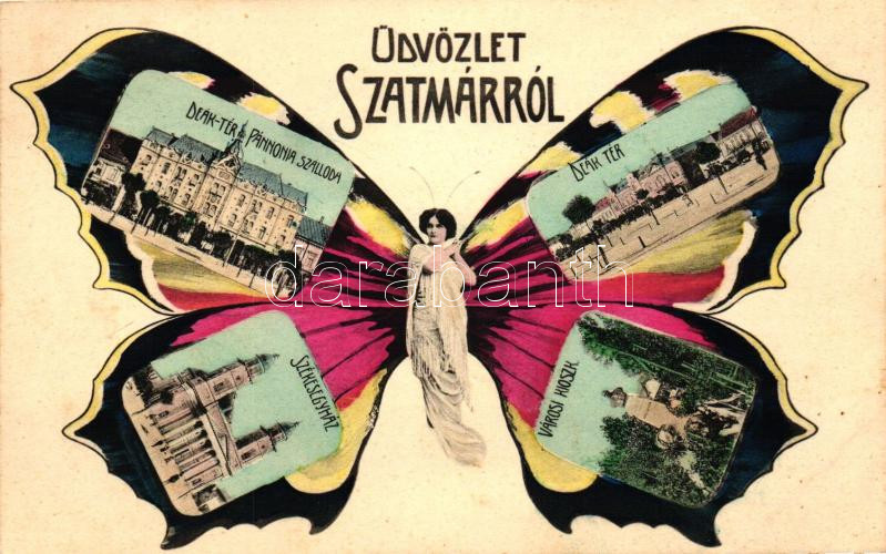 Leírás: Szatmár, Deák tér, Pannónia szálloda, székesegyház, Városi kioszk, pillangó hölgy, kiadja Weisz Izsák / square, hotel, cathedral, kiosk, butterfly lady
