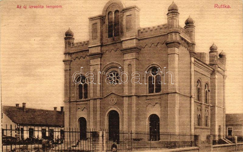 Leírás: Ruttka, Vrútky; az új Izraelita templom, zsinagóga; ex libris a hátoldalon, kiadja Gerő Henrik / synagouge, ex libris on backside (EB)
