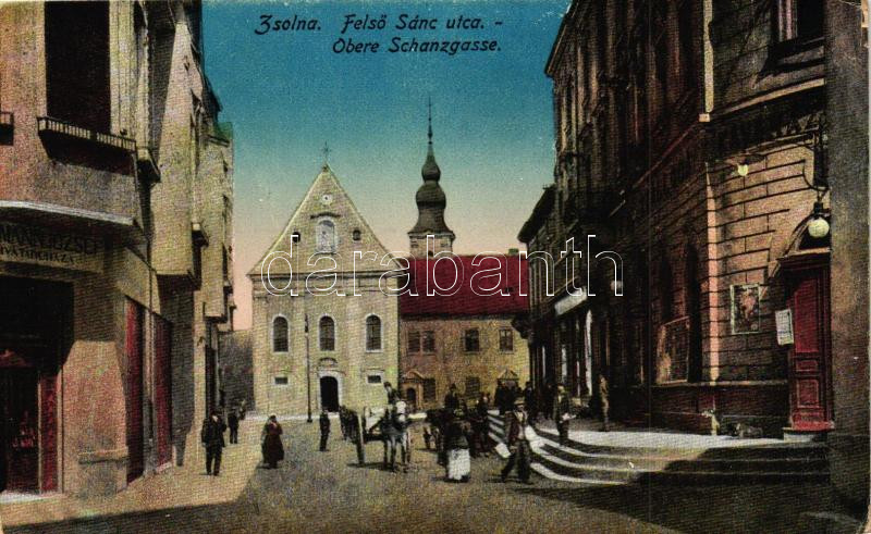 Zsolna, Felső Sánc utca, divatáruház, szálloda / street with shop (fa) https://www.darabanth.com/hu/260-Gyorsarveres/260.0/Kepeslapok/Felvidek~100022/Zsolna-Felso-Sanc-utca-divataruhaz-szalloda-street-with-shop-fa~II1271907