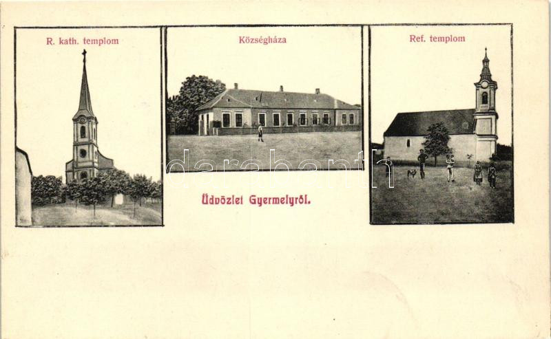 Gyermely, Római Katolikus templom, Községháza, Református templom https://www.darabanth.com/hu/260-Gyorsarveres/260.0/Kepeslapok/Magyarorszag~100019/Gyermely-Romai-Katolikus-templom-Kozseghaza-Reformatus-templom~II1283670