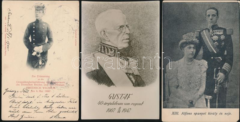 4 db VEGYES motívum képeslap, uralkodók és családtagjaik, II. Erzsébet angol királynő, XIII. Alfons spanyol király, V. Gusztáv svéd király, Vilmos német koronaherceg / 4 mixed motive postcards, rulers and royal families, Elisabeth II of England, Alfonso XIII of Spain, Gustav V of Sweden, Wilhelm German Crown Prince