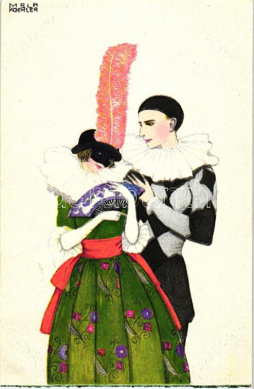 Couple in costumes, B.K.W.I. 620-5. s: Mela Koehler https://www.darabanth.com/hu/260-Gyorsarveres/260.0/Kepeslapok/Muveszlapok~100106/Couple-in-costumes-BKWI-620-5-s-Mela-Koehler~II1284824