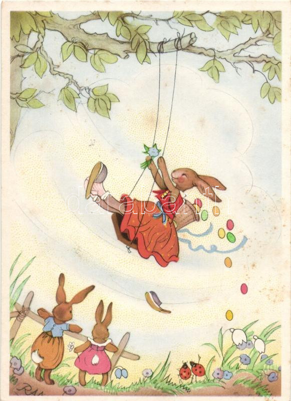 Easter, rabbit family, Charlotte Baron E.B.D. Nr. 4033. s: R.A.A.(fl) https://www.darabanth.com/hu/260-Gyorsarveres/260.0/Kepeslapok/Udvozlolapok-Unnepek~100077/Easter-rabbit-family-Charlotte-Baron-EBD-Nr-4033-s-RAAfl~II1249568