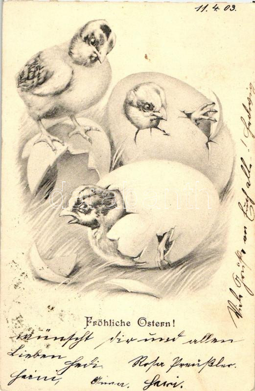 'Fröhliche Ostern!' / Easter, chicken (EK) https://www.darabanth.com/hu/260-Gyorsarveres/260.0/Kepeslapok/Udvozlolapok-Unnepek~100077/Frohliche-Ostern-Easter-chicken-EK~II1239467