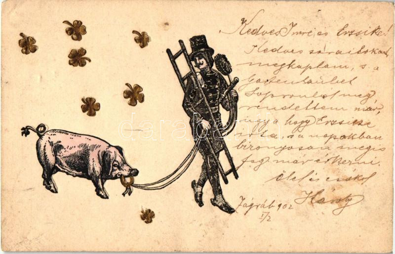 New Year, chimney sweeper, pig, clovers, golden decoration, Emb., B.R.... https://www.darabanth.com/hu/260-Gyorsarveres/260.0/Kepeslapok/Udvozlolapok-Unnepek~100077/New-Year-chimney-sweeper-pig-clovers-golden-decoration-Emb-BRW-No-375-EM~II1281503