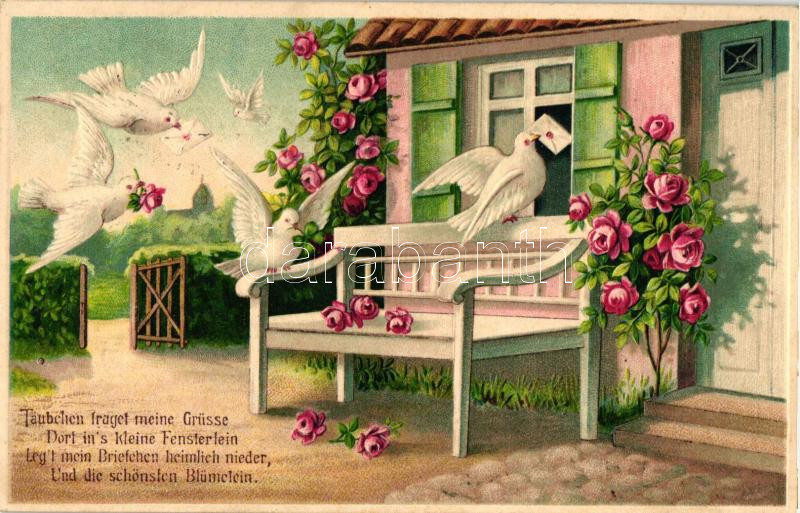 Leírás: 'Taubchen traget meine Grüsse...' / Doves with letters, roses, litho, Emb.