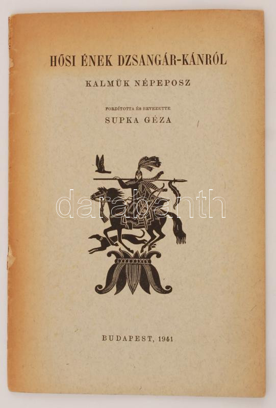 Hősi ének Dzsangár-kánról. Kalmük népeposz. Ford., bev. Supka Géza. Bp., 1941, Franklin. Klny. a Budapesti Szemle 1941. évi évfolyamából, megjelent 100 példányban. Kicsit szakadt papírkötésben, egyébként jó állapotban.