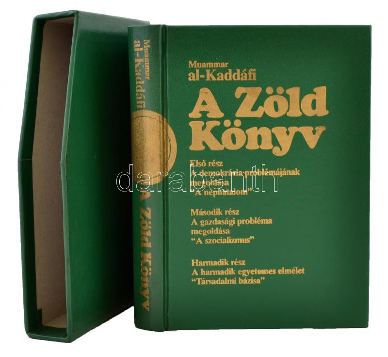 Leírás: al-Kaddáfi, Muammar: A Zöld Könyv. Bp., [1988], A Líbiai Arab Népi Szocialista Dzsamáhirijja népi irodája. Műbőrkötésben, mappában, jó állapotban.