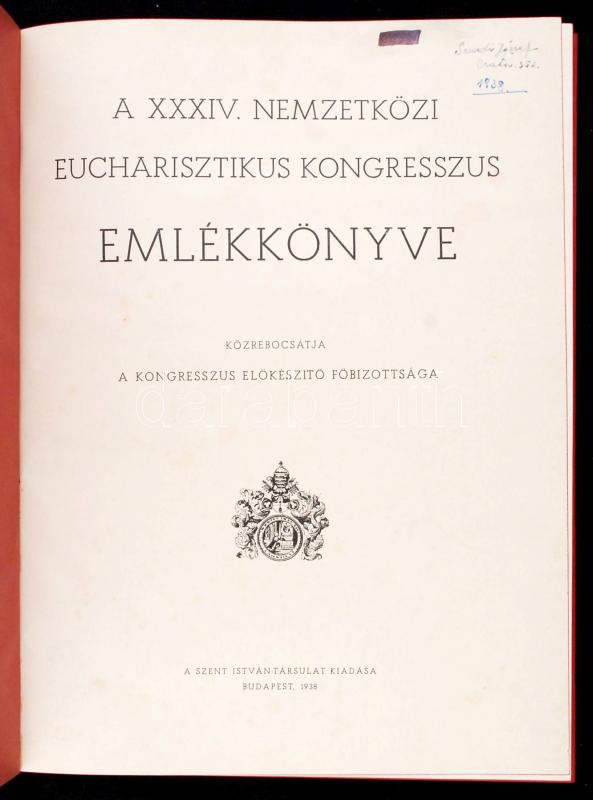 Leírás: A XXXIV. Nemzetközi Eucharisztikus kongresszus emlékkönyve. Budapest, 1938, Szent István- Társulat. Kiadói egészvászon kötésben.