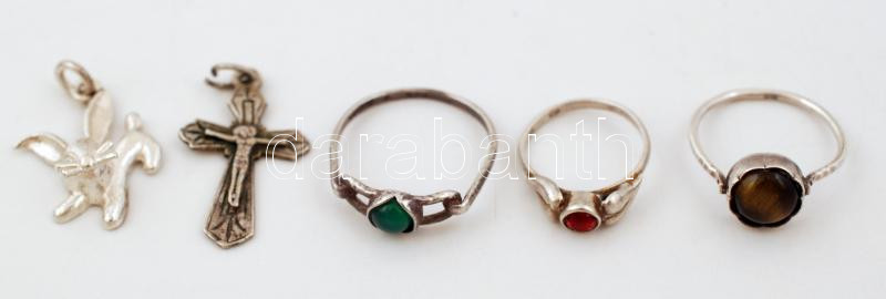 Leírás: Kis ezüst (Ag.) tétel: 3 db gyűrű kő berakásokkal, 1 db kis feszület, 1 db nyulas kis medál, jelzettek, különböző méretben, br 7,9 g