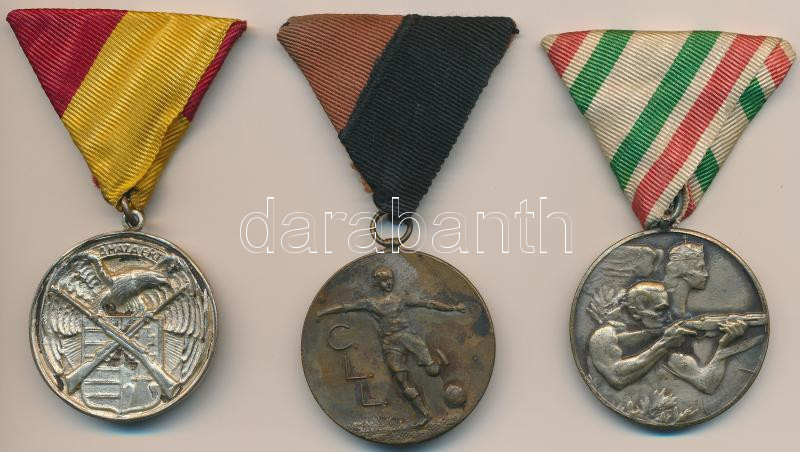 Leírás: ~1930-1940. "Hunyadi János Polgári Lövész Egyesület Budapest VII. Kerület" fém díjérem mellszalaggal + "Hazáért" ezüstözött fém lövész díjérem mellszalaggal + "C.L.L." Br futball díjérem mellszalaggal T:2,2-
