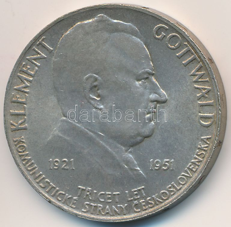 Czechosl... https://www.darabanth.com/hu/260-Gyorsarveres/260.0/Numizmatika/Kulfoldi-fem-es-ezustpenzek~300020/Csehszlovakia-1951-100K-Ag-Klement-Gottwald-T2-Czechoslovakia-1951-100-Korun-Ag-Klement-Gott~II1280955