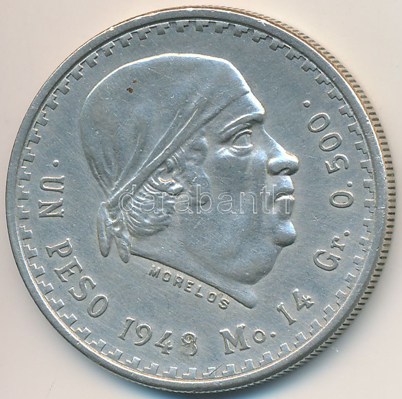Mexico 1948. 1 Peso Ag C:XF https://www.darabanth.com/hu/260-Gyorsarveres/260.0/Numizmatika/Kulfoldi-fem-es-ezustpenzek~300020/Mexiko-1948-1P-Ag-T2--Mexico-1948-1-Peso-Ag-CXF~II1280573