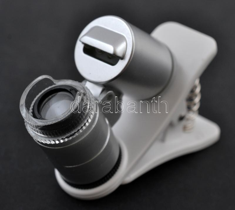 Új, mobiltelefon kamerájára szerelhető 60x-os LED-es nagyító hozzá rögzített lámpával, eredeti dobozában, leírással