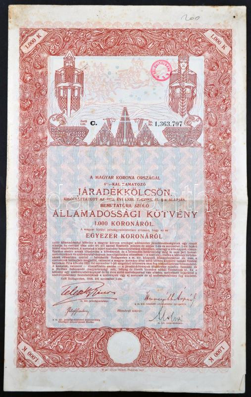 Budapest 1916. "A Magyar Korona Országai 6%-kal kamatozó járadékkölcsön" államadóssági kötvény 1000K-ról, szelvényekkel, szárazpecséttel és bélyegzéssel T:III