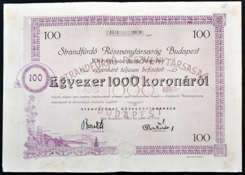 Budapest 1923. "Strandfürdő Részvénytársaság Budapest" részv... https://www.darabanth.com/hu/260-Gyorsarveres/260.0/Numizmatika/Reszvenyek-es-sorsjegyek~300027/Budapest-1923-Strandfurdo-Reszvenytarsasag-Budapest-reszvenye-100000K-rol-szelvenyekk~II1287672