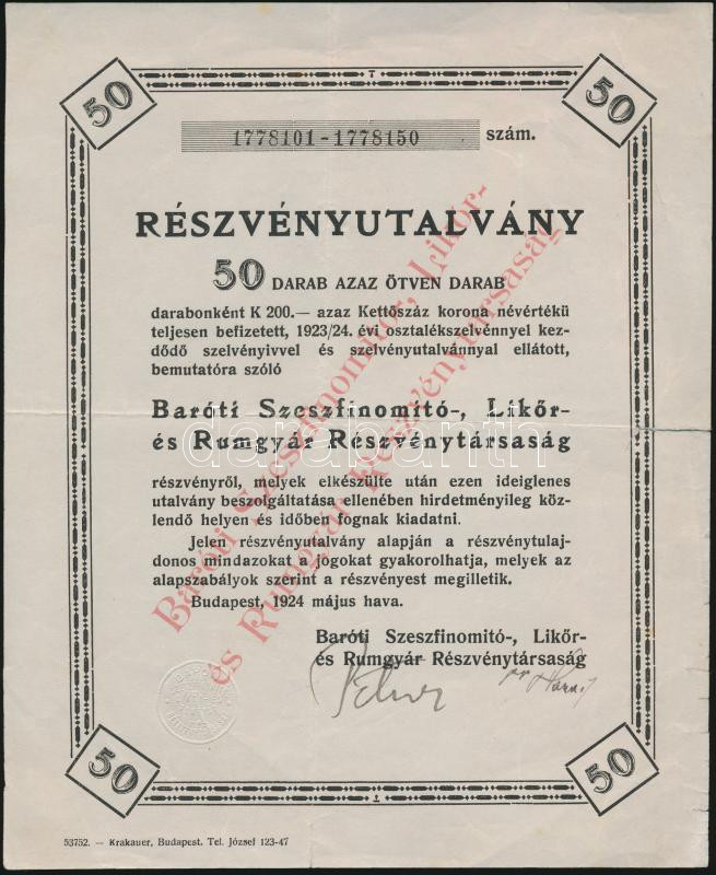 Leírás: Budapest 1924. "Baróti Szeszfinomító-, Likőr- és Rumgyár Részvénytársaság" részvényutalvány 50db részvényről egyenként 200K-ról T:III,III-