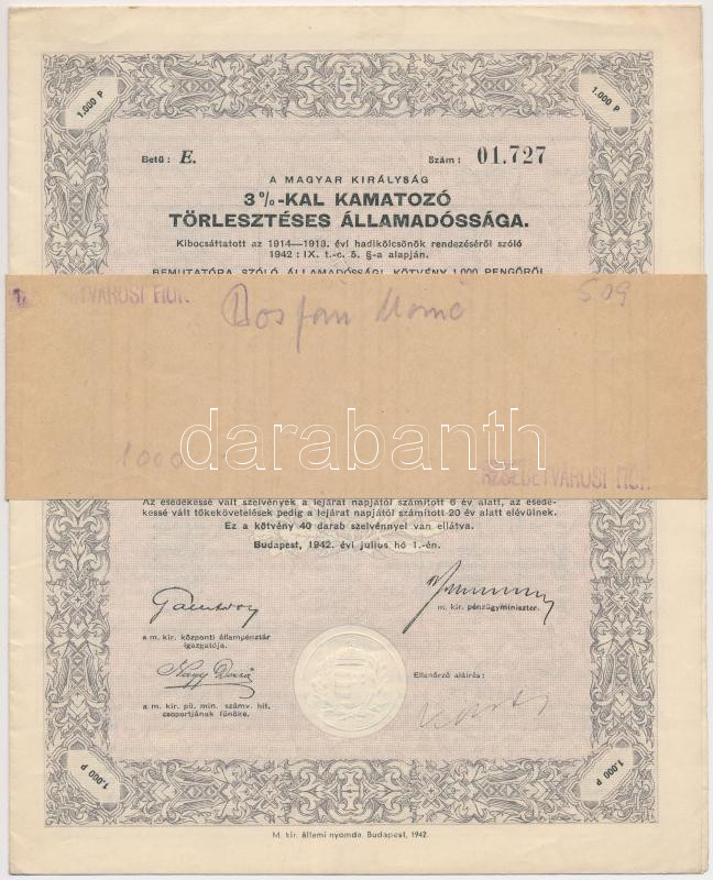 Leírás: Budapest 1942. "A Magyar Királyság 3%-kal Kamatozó Törlesztéses Államadóssága" kötvény 1000P-ről, szelvényekkel és szárazpecséttel T:II