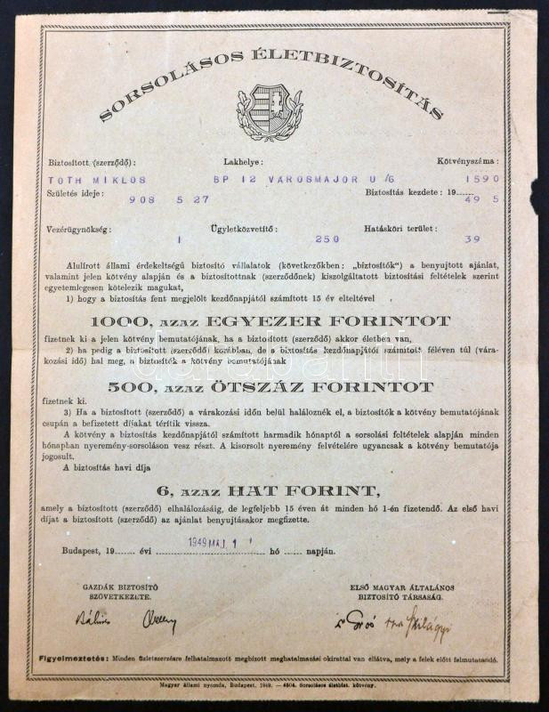 Budapest 1949. "Sorsolásos életbiztosítás" T:III https://www.darabanth.com/hu/260-Gyorsarveres/260.0/Numizmatika/Reszvenyek-es-sorsjegyek~300027/Budapest-1949-Sorsolasos-eletbiztositas-TIII~II1287728