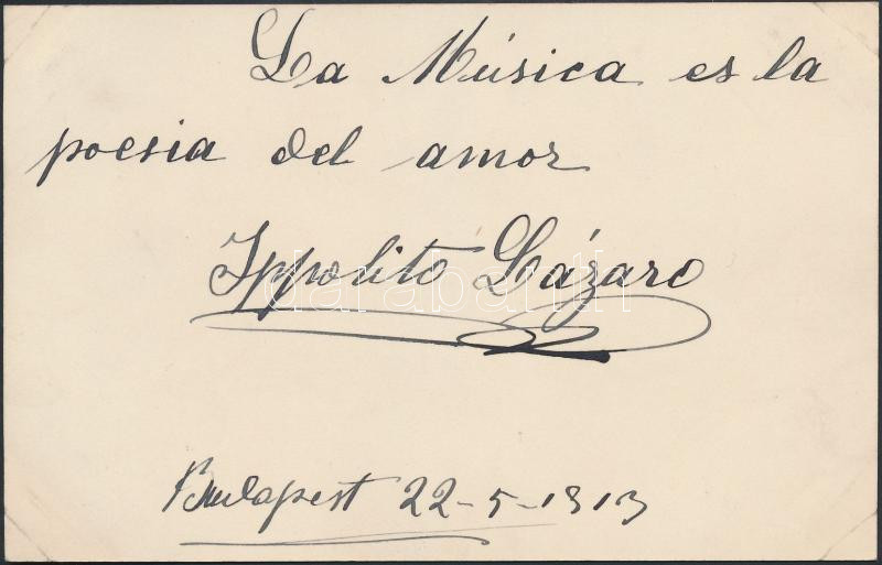 1913 Ippolito Lázaro(1887-1974) spanyol tenor sajátkezű aláírása https://www.darabanth.com/hu/261-Gyorsarveres/261.0/Festmeny-mutargy-papirregiseg-egyeb/Alairas~17/1913-Ippolito-Lazaro1887-1974-spanyol-tenor-sajatkezu-alairasa~II1295509