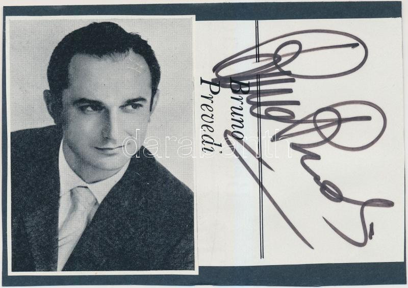 Leírás: Bruno Prevedi (1928-1988) olasz tenor operaénekes saját kezű aláírása egy a művészt ábrázoló nyomtatványon, 13x9cm