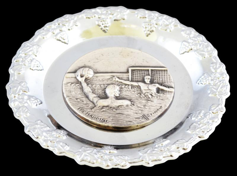 Leírás: Elie Mardini vízilabdás tálka, ezüstözött fém, jelzett, d:9,5 cm