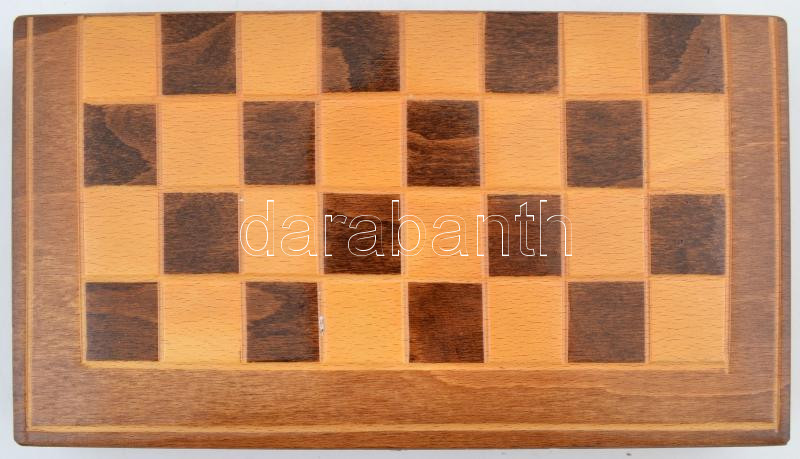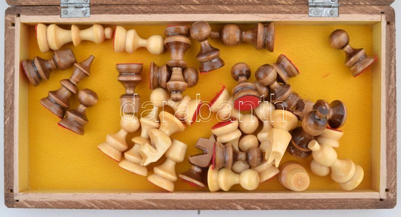 Leírás: Fa sakk-készlet kisméretű figurákkal, hiánytalan, szép állapotban, 27x26 cm