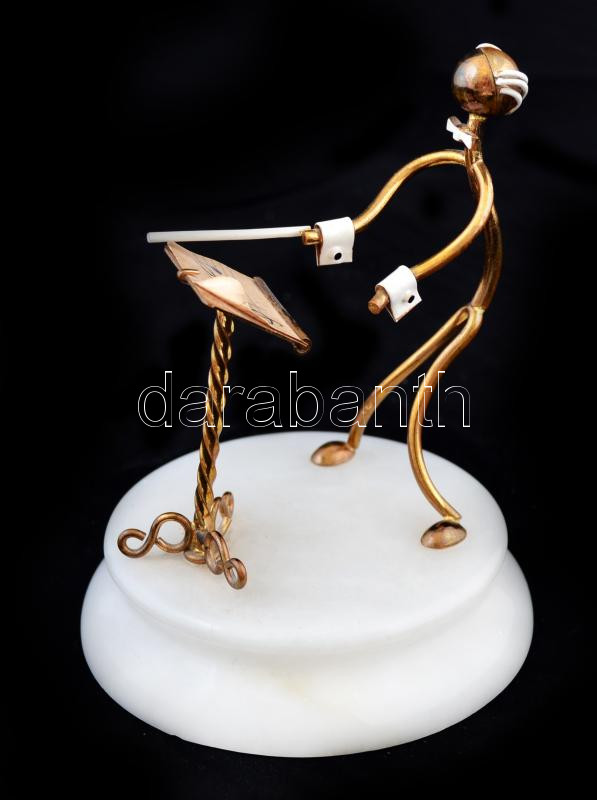 Leírás: Jelzés nélkül: Karmester, festett réz figura, alabástrom talapzaton, m:9 cm