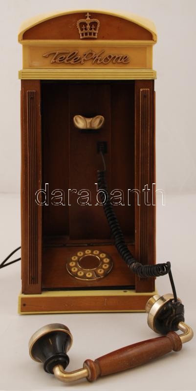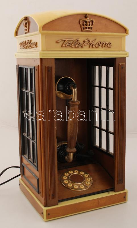 Leírás: Kicsinyített telefonfülke telefonnal, fa-műanyag, nem kipróbált, m:45
