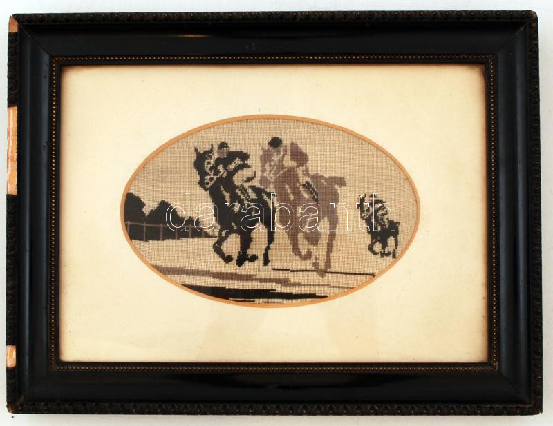 Leírás: Lóverseny, goblein kép sérült keretben, 12×18 cm