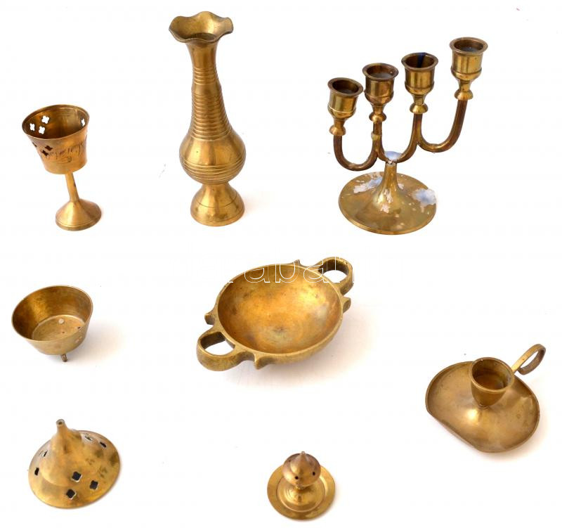 Leírás: Vegyes réz tétel: gyertyatartó, fűszertartó, váza, kis kupa, stb., összesen: 8 db