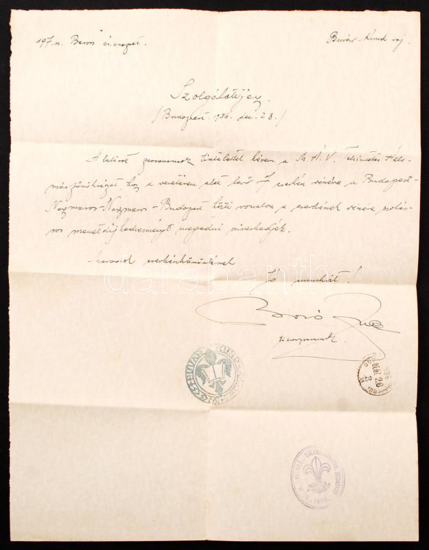 Leírás: 1936 Bozó Gyula festő, éremművész aláírása a MÁV-hoz cserkész ügyben intézett levélen, cserkészpecsétekkel