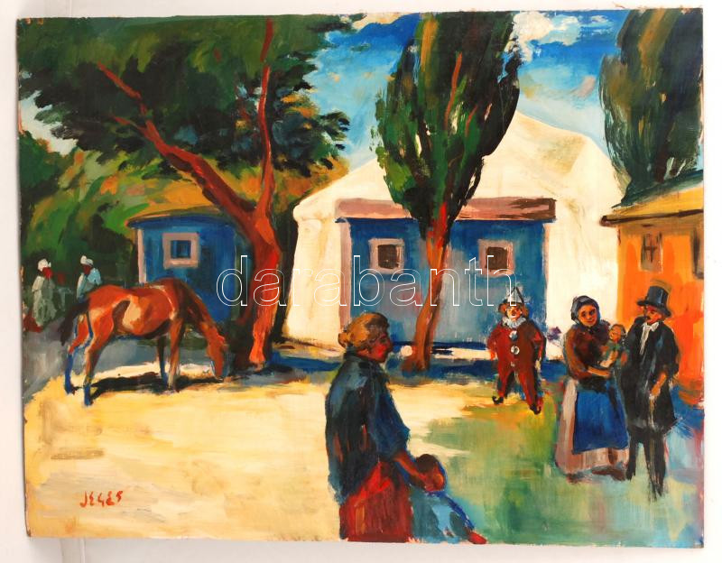 Jeges jelzéssel: Bohóc a pódium mögött. Olaj, falemez, 48×62 cm https://www.darabanth.com/hu/261-Gyorsarveres/261.0/Festmeny-mutargy-papirregiseg-egyeb/Festmenyek-es-grafikak~400099/Jeges-jelzessel-Bohoc-a-podium-mogott-Olaj-falemez-48C39762-cm~II1238022