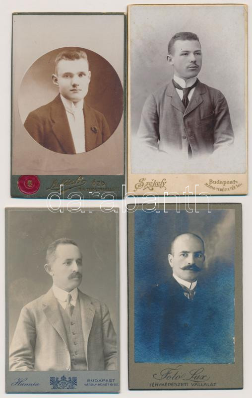 Leírás: cca 1900-15 Vegyes, keményhátú kabinetfotó férfiakról különböző magyar (benne Székely Aladár fotó is) és külföldi műtermekből, 10db, cca 10x6cm