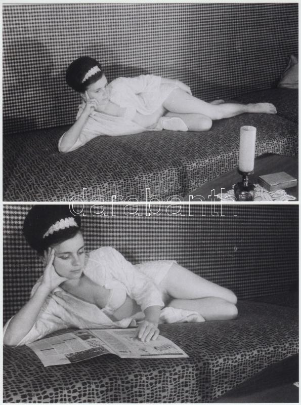Leírás: cca 1968 Lopott órák Júliával, 9 db finoman erotikus fénykép, korabeli negatívokról készült modern nagyítások, 15x10 cm / 9 erotic photos, 15x10 cm