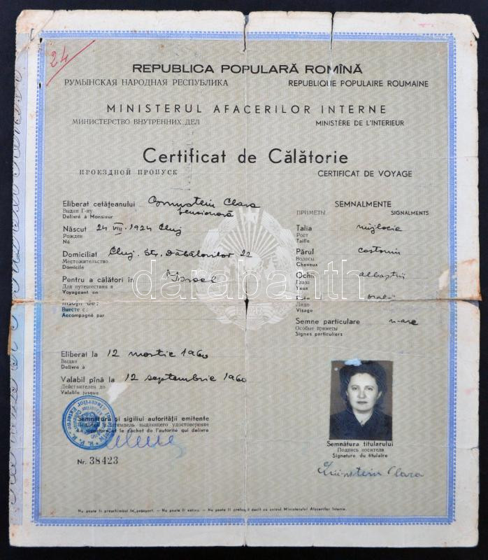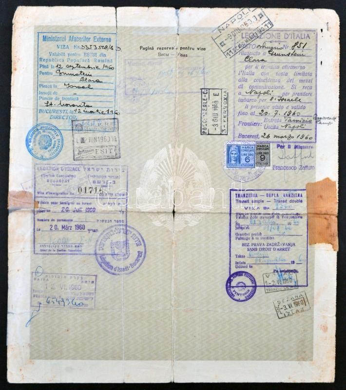 Leírás: 1960 Román kivándorló útlevél Izraelbe, különböző vizumokkal (olasz, izraeli, jugoszláv), pecséttel, és olasz okmány bélyeggel, szakadásokkal, 29x25cm