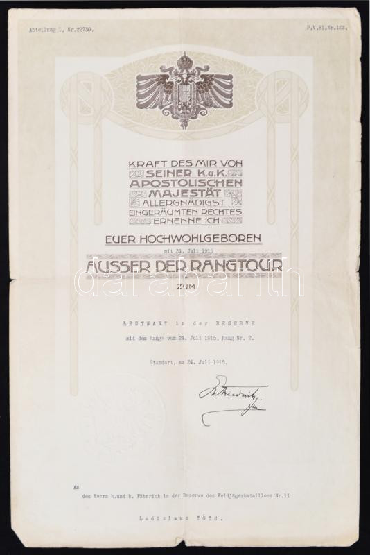 1915 Magyar katona tartalékos hadnagyi kinevezése. Hadügyminisztériumi... https://www.darabanth.com/hu/261-Gyorsarveres/261.0/Festmeny-mutargy-papirregiseg-egyeb/Militaria~24/1915-Magyar-katona-tartalekos-hadnagyi-kinevezese-Hadugyminiszteriumi-szarazpecsettel-Appoi~II1260765