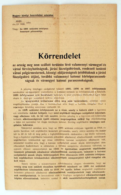 1920 Körrendelet: Az 1899. születési évfolyam bemutató pótszemléje, Ma... https://www.darabanth.com/hu/261-Gyorsarveres/261.0/Festmeny-mutargy-papirregiseg-egyeb/Militaria~24/1920-Korrendelet-Az-1899-szuletesi-evfolyam-bemutato-potszemleje-Magyar-kiralyi-honvedel~II1295811