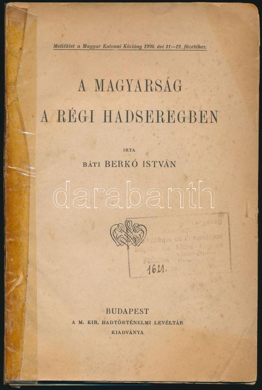 Báti Berkó István: A magyarság a régi hadseregben. Melléklet a Magyar Katonai Közlöny 1926. évi 11-12. füzetéhez. ragasztott fedőborítóval, pp.:74, 23x15cm