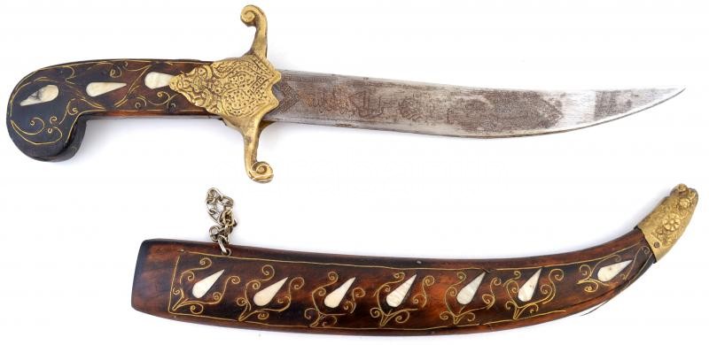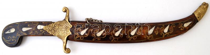 Leírás: Keleti motívumos dísztőr, gyöngyház berakásos fa hüvellyel, pengehossz: 34,5 cm, teljes hossz: 38,5 cm