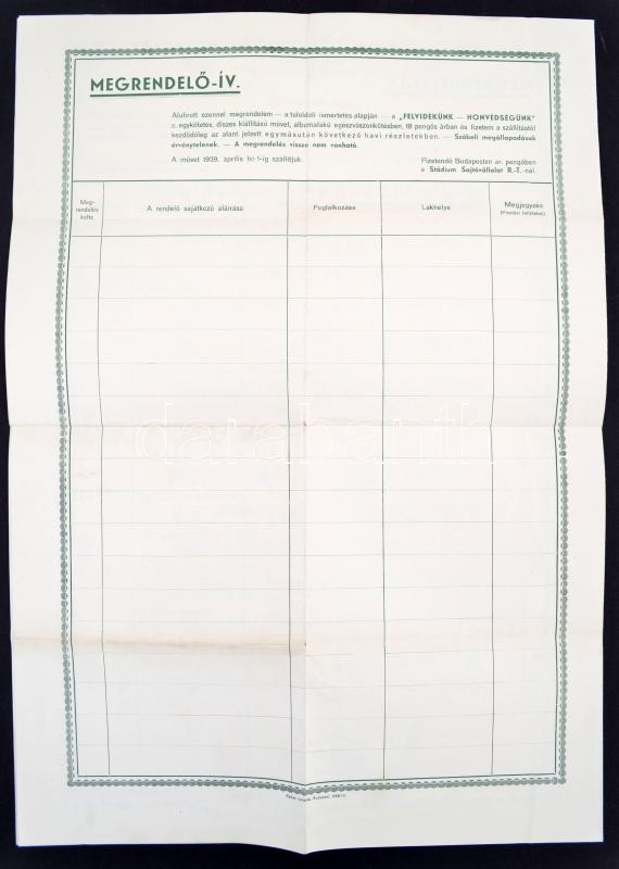 cca 1938 Felvidékünk - Honvédségünk c. könyv megrendelő íve. Nagyméret... https://www.darabanth.com/hu/261-Gyorsarveres/261.0/Festmeny-mutargy-papirregiseg-egyeb/Militaria~24/cca-1938-Felvidekunk--Honvedsegunk-c-konyv-megrendelo-ive-Nagymeretu-nyomtatvany-ter~II1297940
